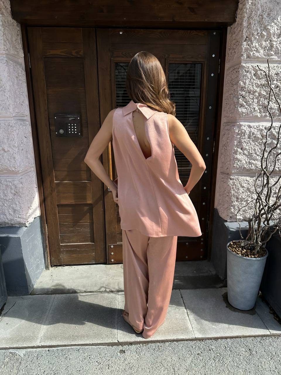 Блуза без рукавов с воротником стойкой, женственным вырезом на спине и боковыми высокими разрезами:
