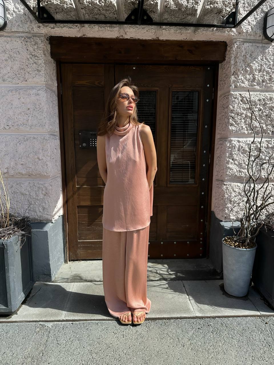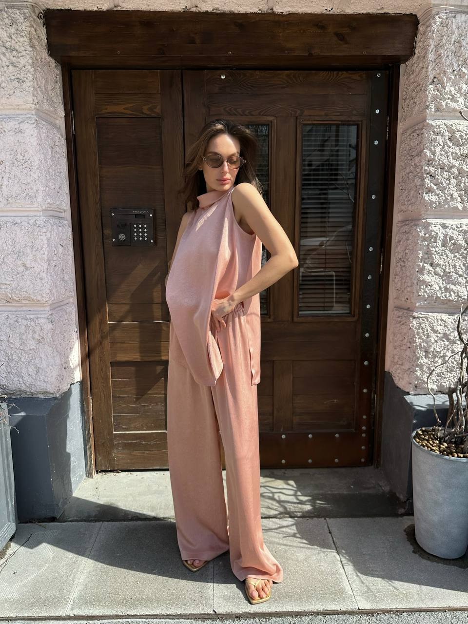 Костюм из струящейся ткани с необычной жатой фактурой.