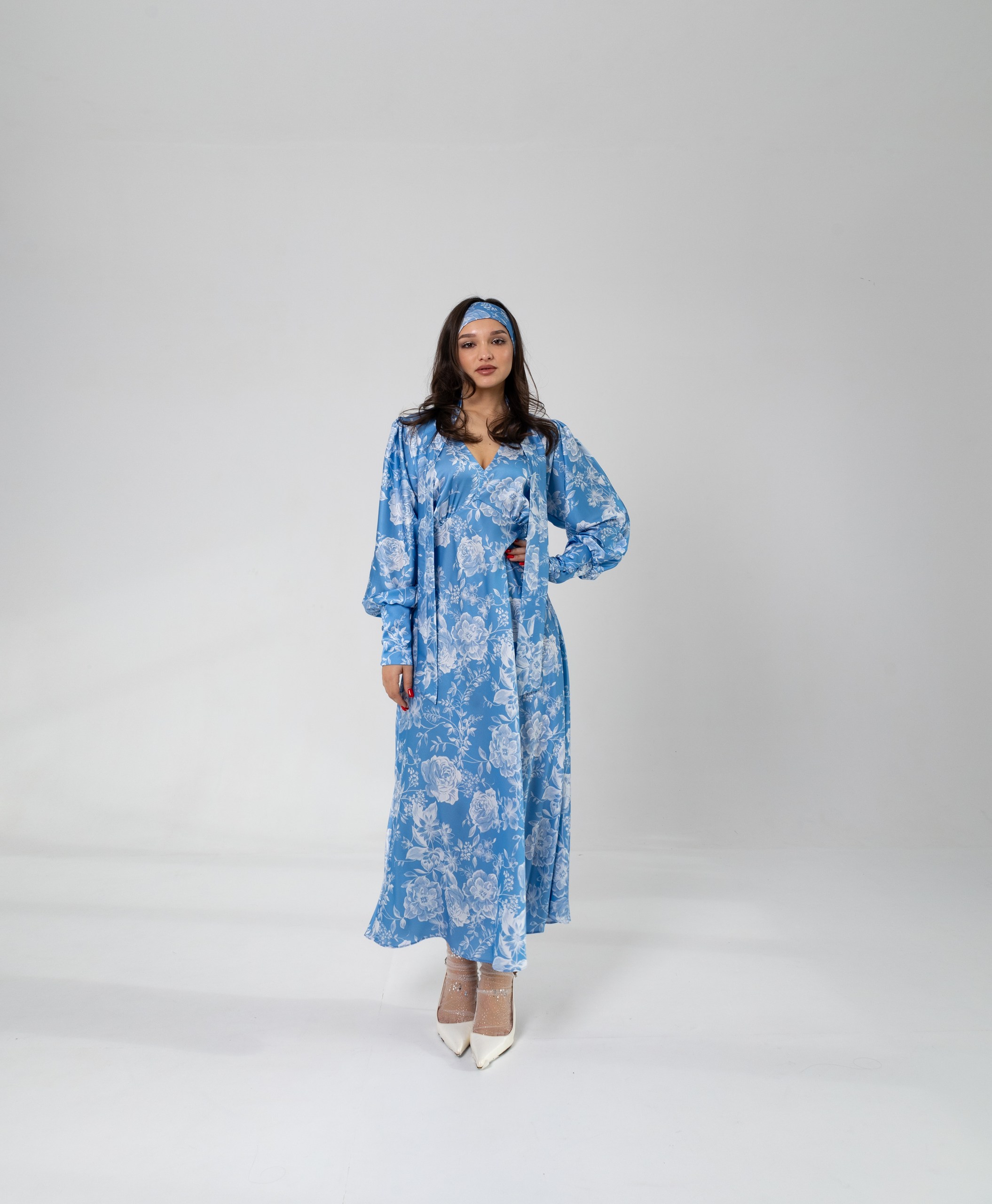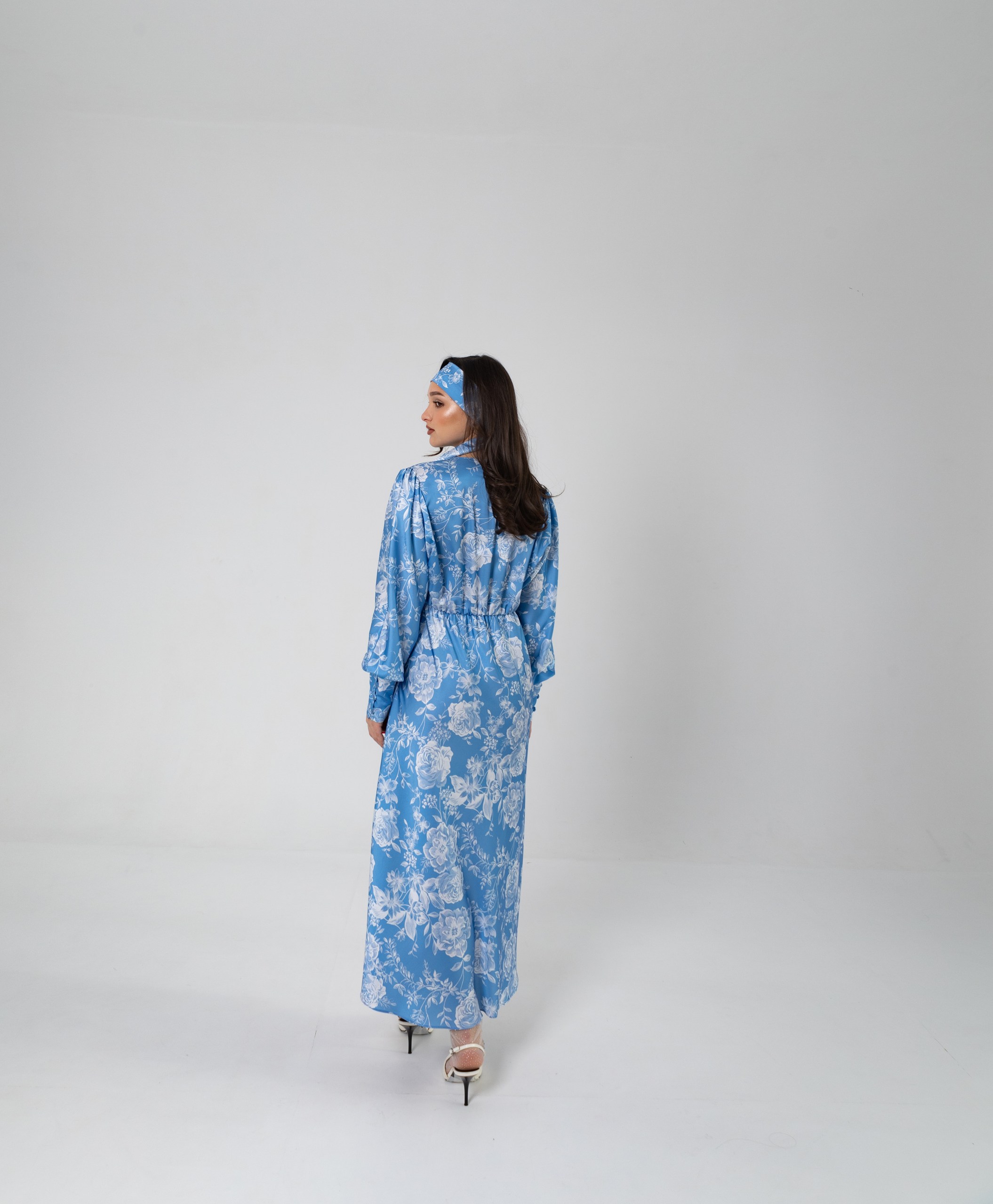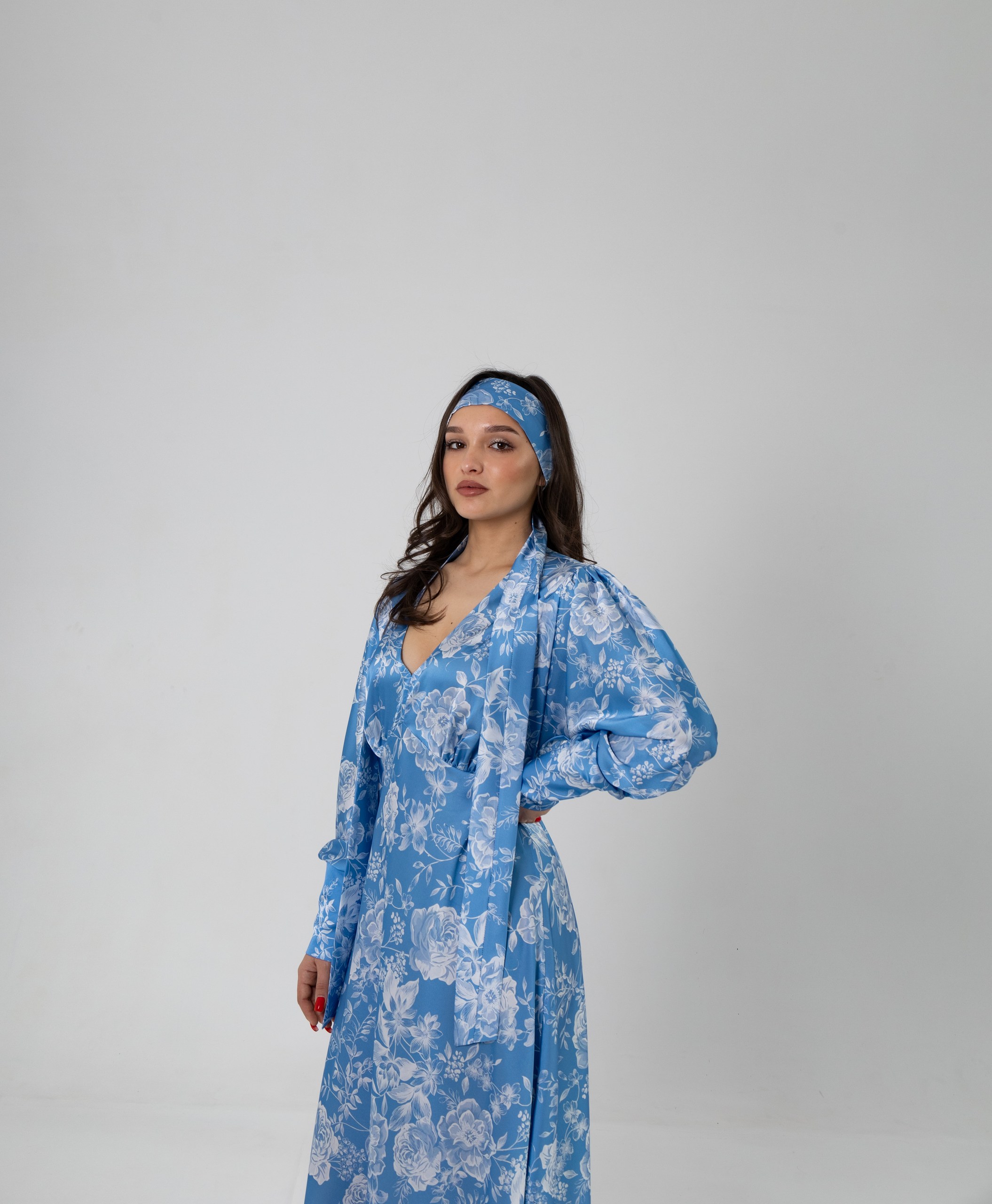 Платье из искусственного шелка , скроено по косой , с акцентом на груди , по спине есть резинка, которая корректирует объем изделия , высокие манжеты с воздушным петлями на рукавах
